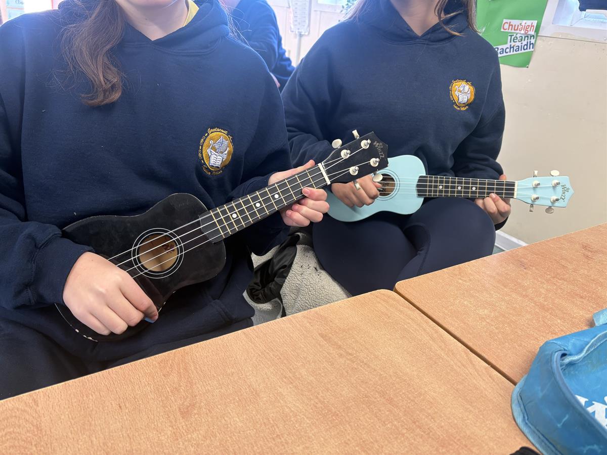 Ina theannta sin, bíonn múinteoir seachtrach ceoil linn a mhúineann ucailéile do ranganna éagsúla. Cuireann na ceachtanna seo deis iontach ar fáil do dhaltaí uirlis a fhoghlaim, rithim a fhorbairt, agus taitneamh a bhaint as ceol i mbealach praiticiúil. Creidimid go dtugann an ceol
